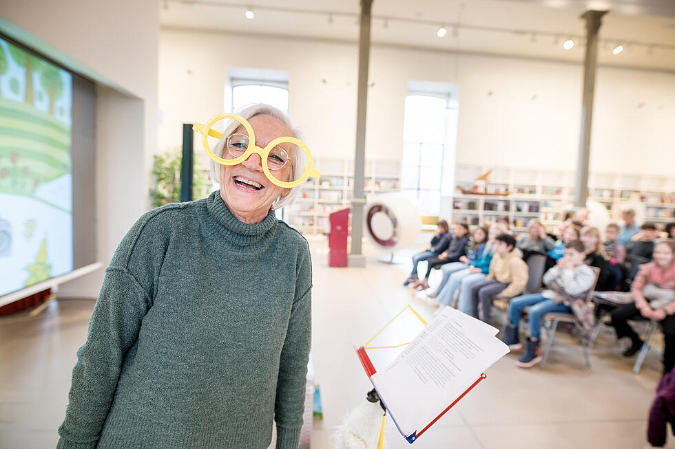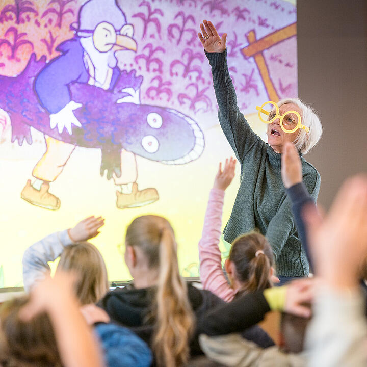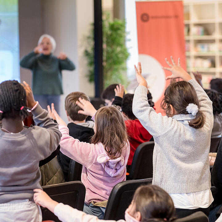 Bereits am Vormittag startete das Programm mit zwei musikalischen Lesungen von Patricia Prawit. Rund 80 Schüler*innen aus zweiten Klassen lauschten begeistert den Geschichten – gesungen, gesprochen und mit viel Charme präsentiert.