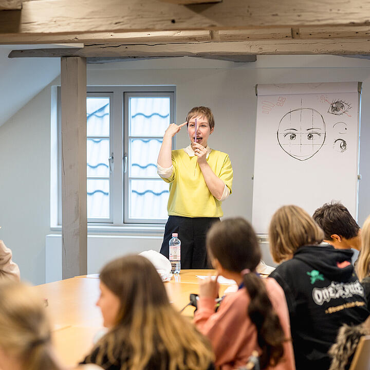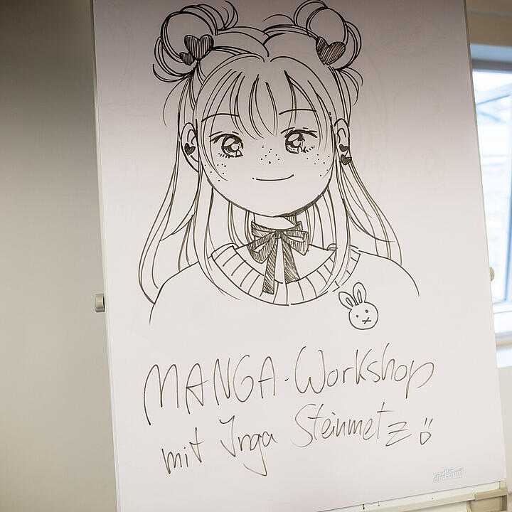 Parallel dazu fand ein Manga-Workshop mit Illustratorin Inga Steinmetz statt. 25 Sechstklässler*innen lernten, wie Manga-Figuren entstehen – vom Gesichtsausdruck bis zur Bewegung.