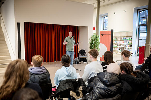 Am Nachmittag ging es literarisch weiter: Schülerinnen der Gemeinschaftsschule präsentierten beim Poetry Slam eigene Texte. Moderiert von Slam-Poet Björn Högsdal, zeigten die jungen Autor*innen, was sie zuvor in Workshops erarbeitet hatten. Mutig, kreativ und mit großer Bühnenpräsenz gaben sie ihre Texte vor Publikum zum Besten – und ernteten viel Anerkennung.