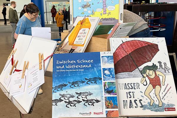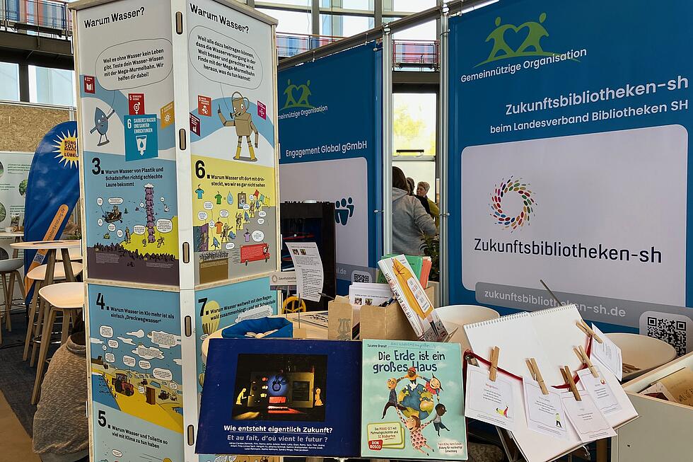 Bereits zum dritten Mal war der Landesverband Bibliotheken SH mit der Initiative Zukunftsbibliotheken-SH zwei Tage lang auf der Messe Go.Grøøn für Nachhaltiges und Faires in Lübeck präsent und konnte sich diesmal durch einen vom Land geförderten Doppelstand mit dem Kooperationspartner Engagement Global (Außenstelle Hamburg) stärker als bisher aufstellen. Dabei rückten in diesem Jahr neben den ausliegenden Infos und Bildungsmaterialien zu Projekten wie „Expedition Natur SH“ und zur alltagsintegrierten Sprachförderung besonders Angebote zum Mitmachen deutlicher in den Mittelpunkt. Mehr Gesprächszeit mit vielen interessierten Messegästen ergab sich zusätzlich durch personelle Verstärkung aus umliegenden Bibliotheken. Am Stehtisch zum Thema Sprachförderung und Natur stand der Austausch mit Fachkräften aus Kitas, Grundschulen sowie mit ehrenamtlichen Lesepaten im Fokus. Viel Aufmerksamkeit in dieser Zielgruppe fand u.a. das in vielen Bibliotheken verteilte Material „Zwischen Schnee und Wüstensand“ mit Geschichten zu Nachhaltigkeitsthemen. Zum Freuen und Schmunzeln im Vorübergehen gab es „Pflück-Gedichte“ zum Mitnehmen und Strandsteine mit einer Idee, die unkompliziert zum naturverbundenen Erzählen anregt. Auch die Kooperationsprojekte mit den Lübecker Bücherpiraten und die dazu entstandenen „bilingual picturebooks“ waren immer wieder Thema