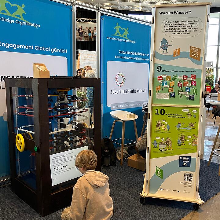 Als Highlight des Doppelstandes erwies sich diesmal aber ganz besonders die große digital gesteuerte, aber als physisches Bewegungsgeschehen zu bestaunende Murmelbahn mit Comic-Säule zum Thema „Warum Wasser?“. Im Rahmen des Programms für Entwicklungsbezogene Bildung in Deutschland (EBD), das von den Außenstellen von Engagement Global umgesetzt wird, wurde diese originelle Kombination aus bewegtem Spiel und visuell lebendig gestalteten Comic-Szenen zum Thema für Menschen ab 8 speziell für Bibliotheken als öffentliche Räume konzipiert. Sie feierte auf der Messe ihren ersten Auftritt, war an beiden Messetagen fast ununterbrochen belagert und besonders bei Vater-Sohn-Tandems beliebt: Während die Kinder den Lauf der Kugel verfolgten und dazu an Fragen knobelten, interessierten sich die Väter für die ausgeklügelte Technik, mit der der Entwickler Artem Semikras von EscRoom Hamburg das Spiel zum Laufen gebracht hat. Auch er stand während der gesamten Messezeit für Gespräche am Stand bereit. Die Inhalte, Texte wie auch das Ineinandergreifen der verschiedenen medialen Elemente bei dieser interaktiven Themenstation wurden in guter Zusammenarbeit zwischen Bibliotheken SH und Engagement Global über viele Monate entwickelt und graphisch von dem Kieler Comic-Künstler Gregor Hinz originell und witzig umgesetzt. Rund 10-15 Minuten dauert es, um die Kugel entlang von interessanten Fragen zumThema Wasser ins Ziel zu bekommen. Dabei hilft es, auf der wimmeligen Comic-Säule, gestaltet aus nachhaltigem Material, nach der richtigen Antwort zu suchen.